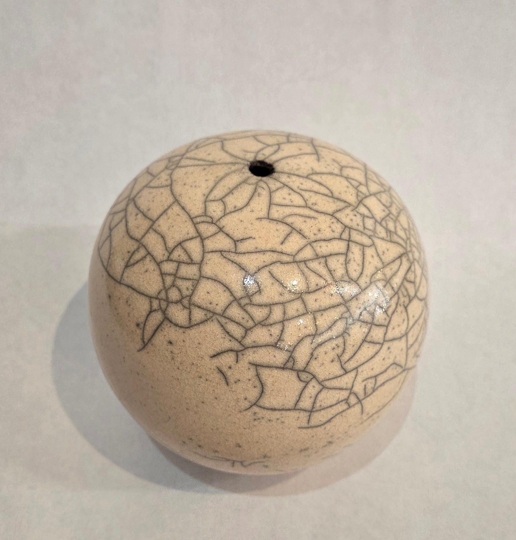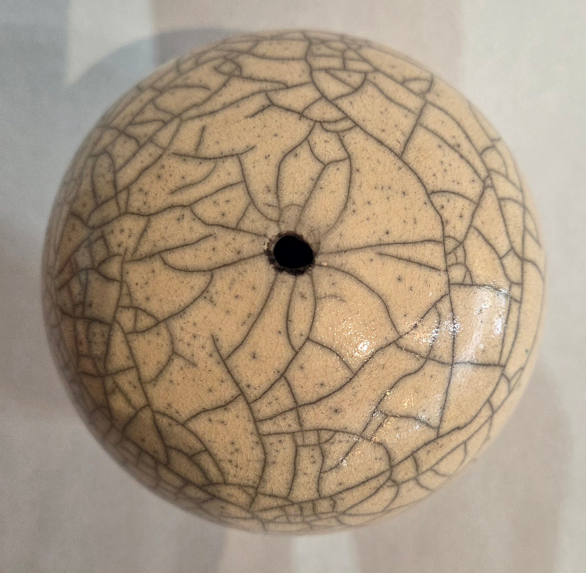 The bold crackles in this beautiful raku vase are a gorgeous example of the beautiful unpredictability of this glazing technique. The creamy color allows it to be displayed in a multitude of decorative color schemes. Measures 5 inches high by 4.5 inches in diameter at it's widest. Base measures 1.5 inches in diameter.