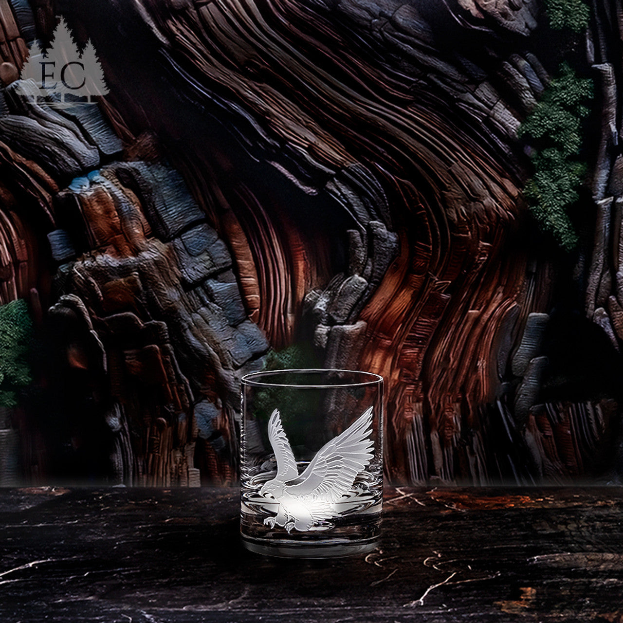 Embrace the spirit of freedom with our captivating Eagle Crystal Rocks Glasses. Crafted from fine crystal for exceptional clarity and weight, these glasses feature a deep-etched design showcasing Lorraine Coyle's stunning artwork of a majestic eagle in flight. These classic rocks glasses feature a sturdy round base featuring a “water drop” element that sets it apart from standard glassware.