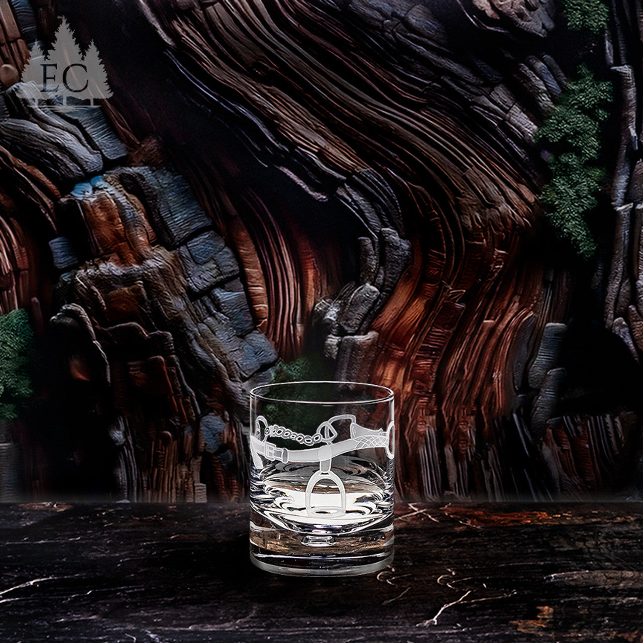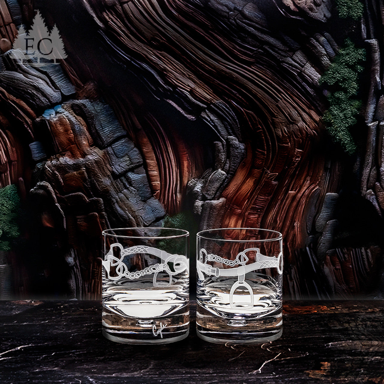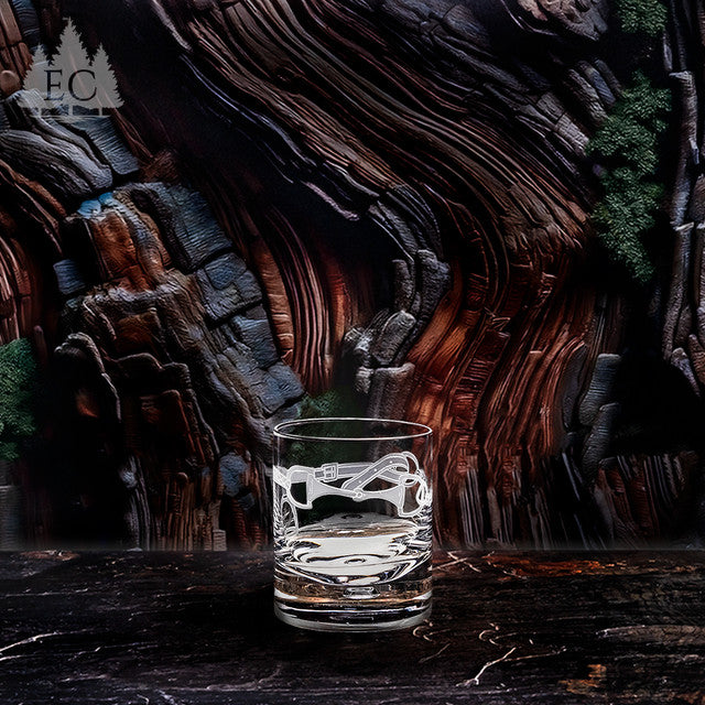 For the western riding enthusiast, this set of two rocks glasses features designs by Lorraine Coyle. This intricate etching of horse tack includes a cinch, a snaffle bit, and a stirrup wrapped around the glasses, creating a sense of western rider charm. Whether you're celebrating a barrel racing or other rodeo victory, or simply enjoying a relaxing drink, this set adds a touch of equestrian flair to any occasion.