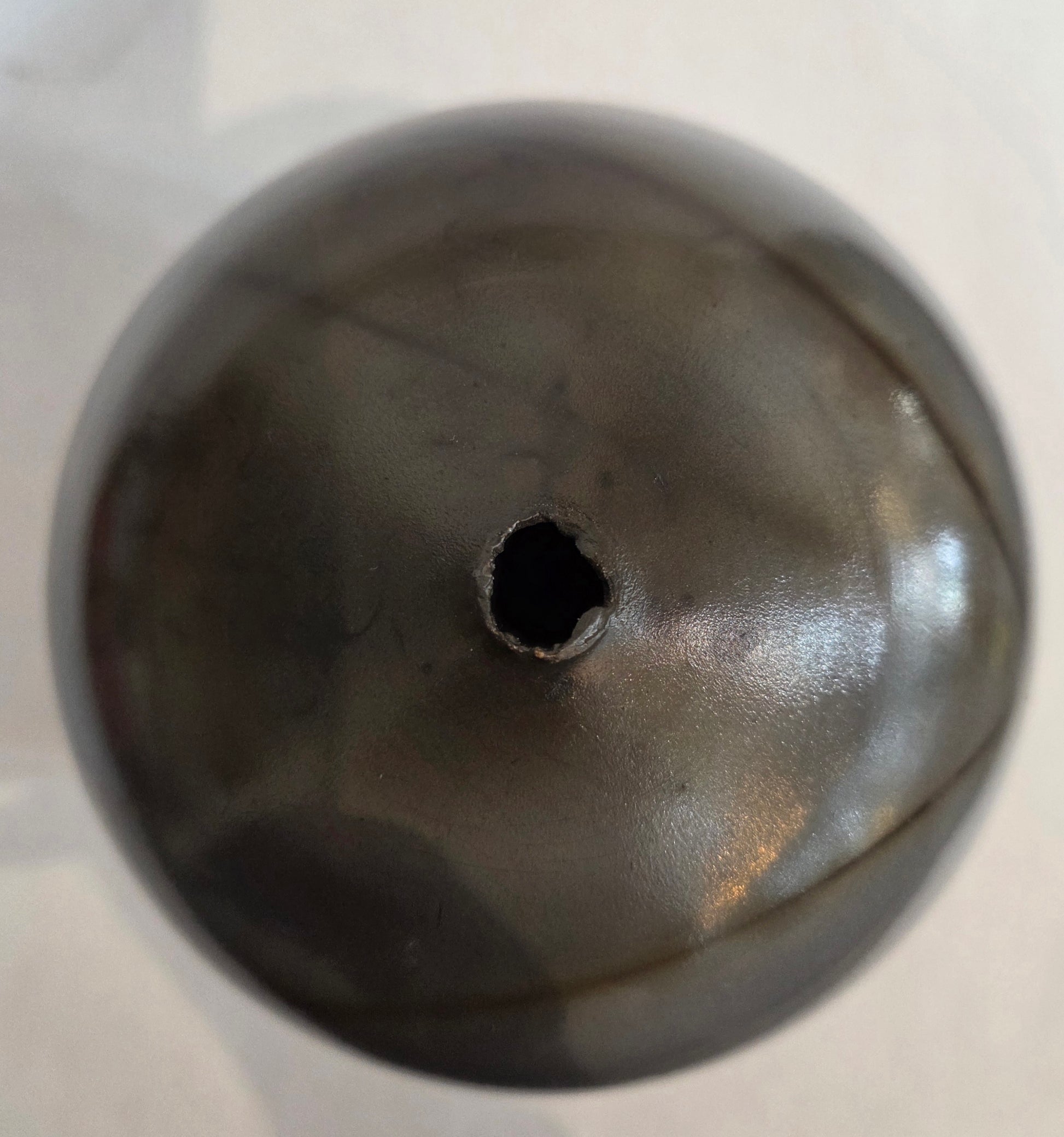 The dark beauty of this saggar fired vase invites the viewer in to discover its secrets. Measuring 6.75 inches high and 5 inches in diameter, with a base of almost 2 inches in diameter. Enjoy the unique patterns and colors that accompany the unpredictability of saggar firing.